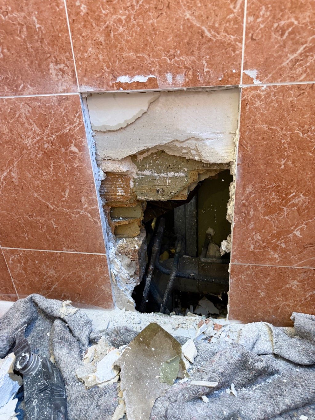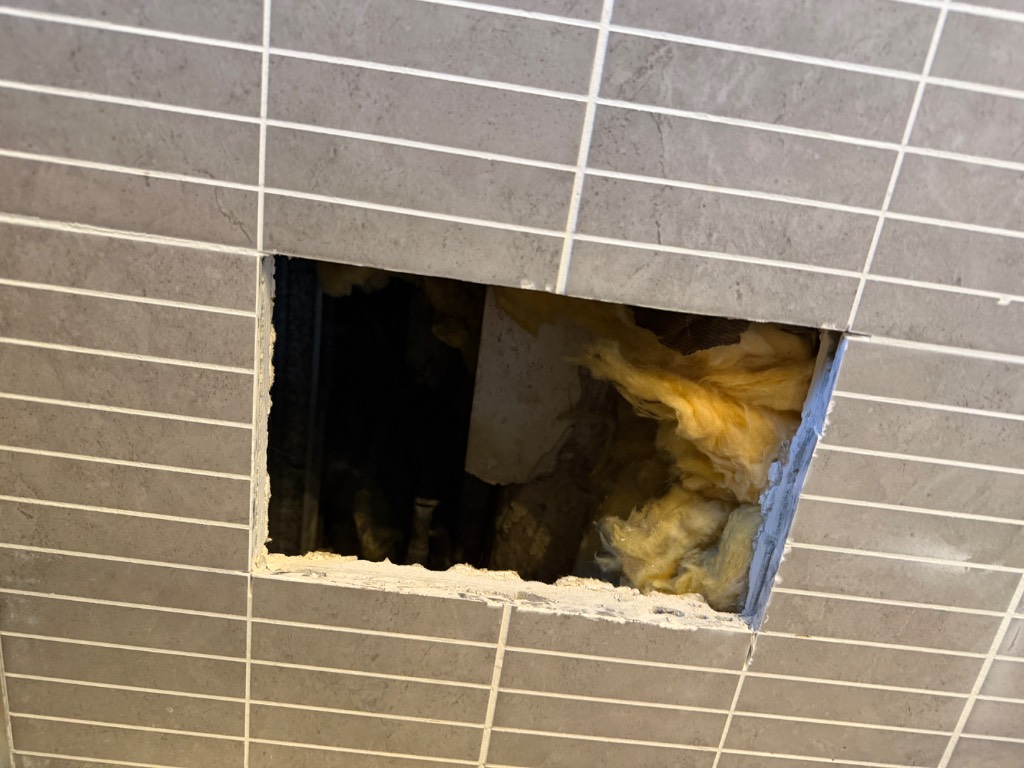 Après investigation, la fuite a été localisée dans un doublage de salle de bain. Le diagnostic a révélé une défaillance sur une soudure d’une canalisation en cuivre, responsable de l’écoulement et des dommages constatés.