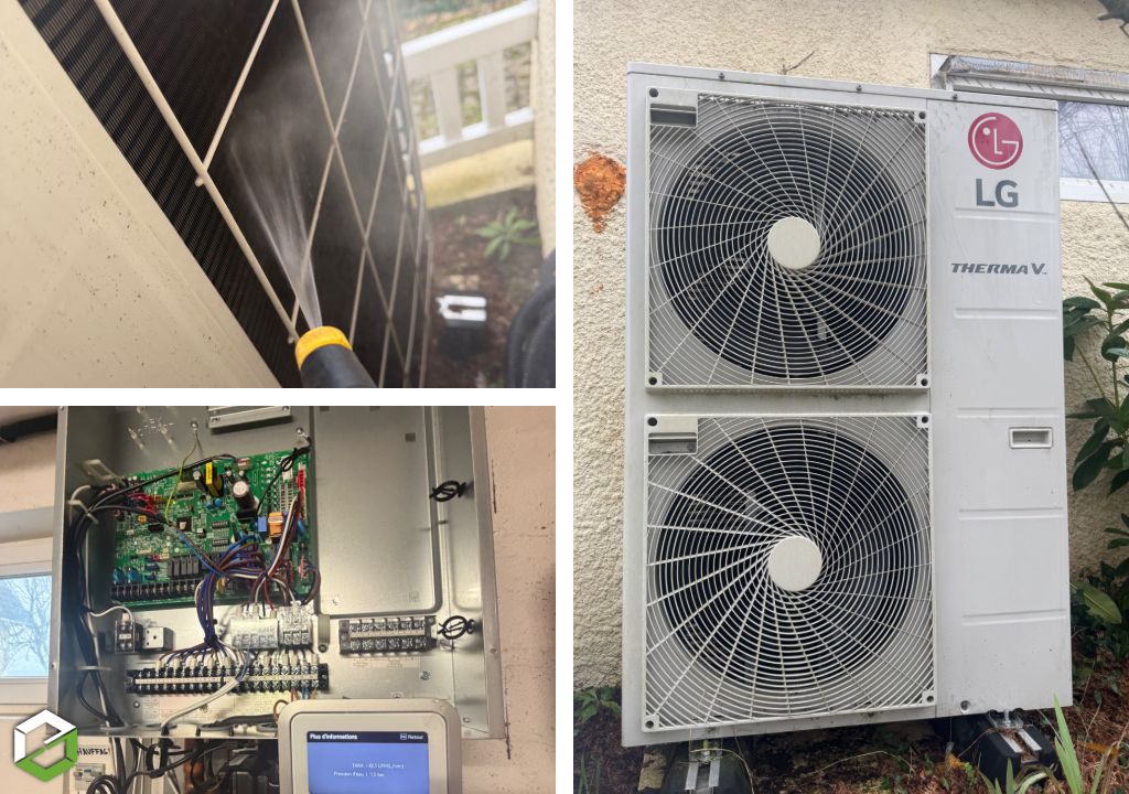 L’intervention a débuté par une inspection générale de l’unité extérieure et du module hydraulique intérieur. Le technicien JB Climat Service a procédé au nettoyage de l’échangeur, à la vérification des ventilateurs et au contrôle des connexions électriques.