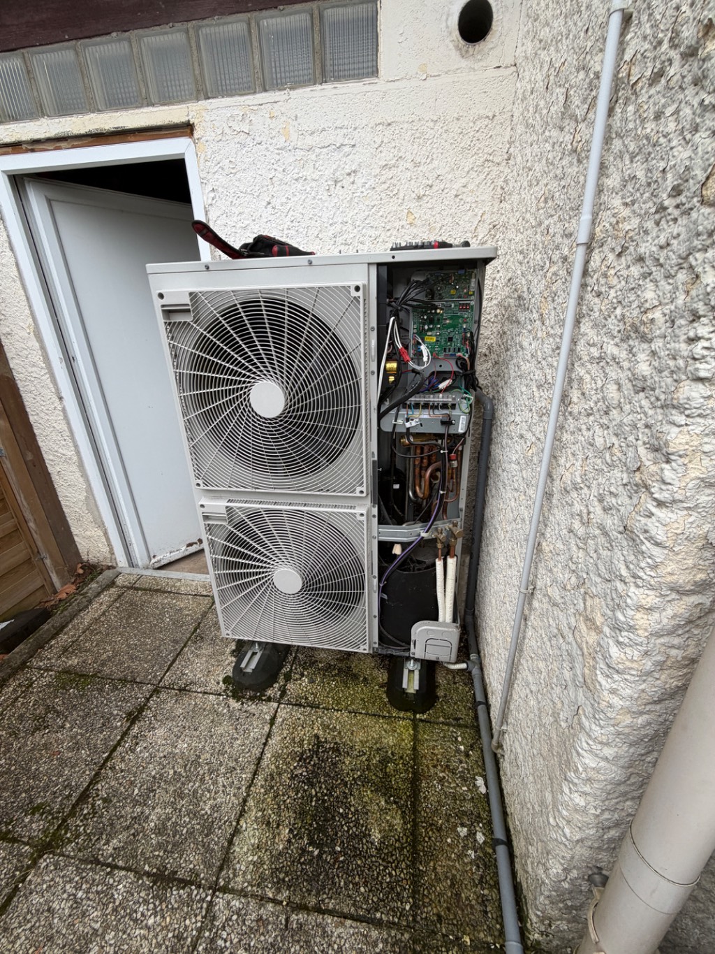Lors de l’intervention, notre technicien a effectué un contrôle général de la pompe à chaleur, incluant l’unité extérieure, le module hydraulique et les organes de sécurité. Les échangeurs ont été vérifiés et nettoyés, les filtres contrôlés, les pressions du circuit hydraulique ajustées et les connexions électriques inspectées.