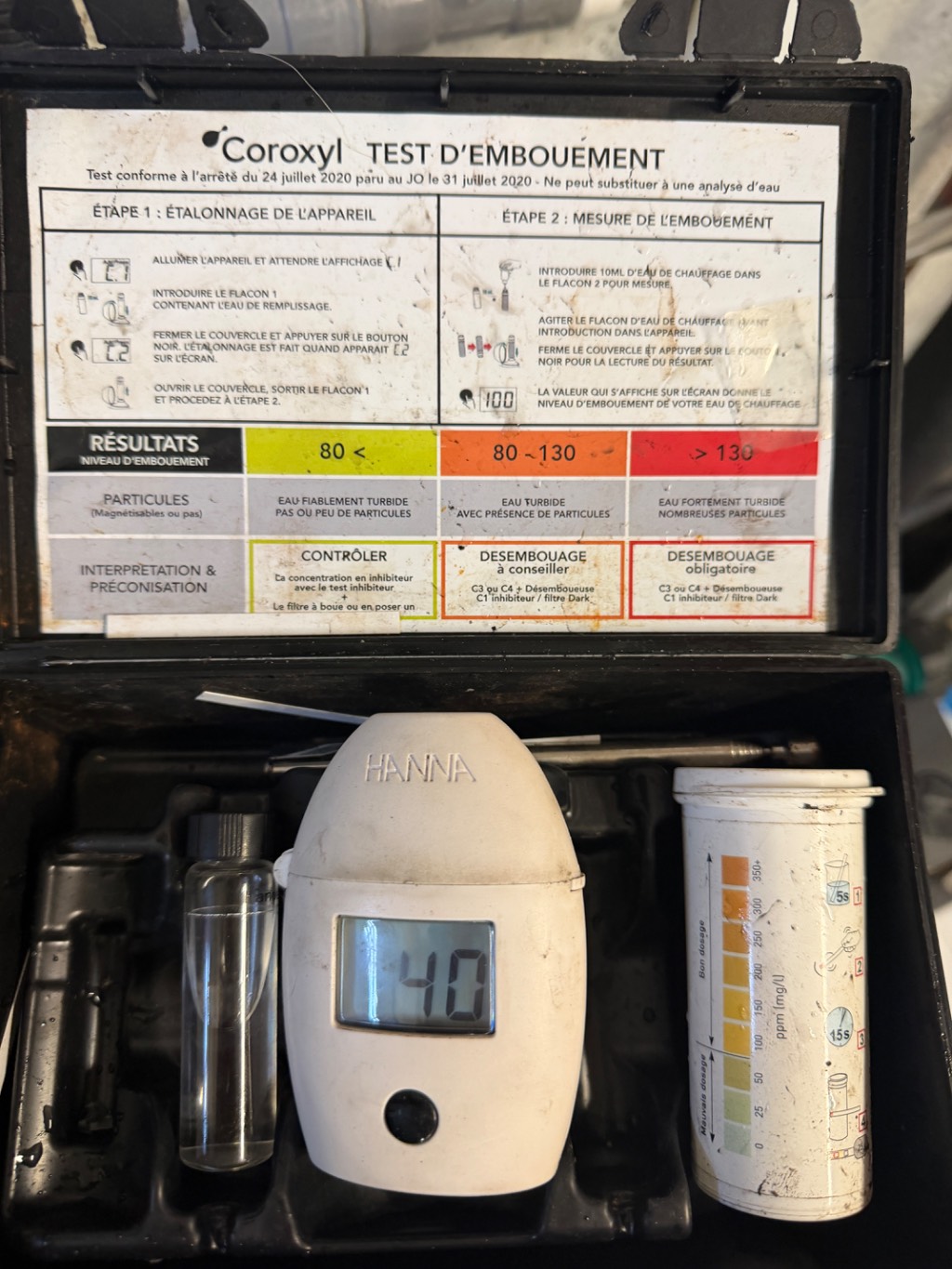 Afin d’assurer un fonctionnement optimal du circuit de chauffage, JB Climat Service a réalisé un contrôle de la turbidité de l’eau à l’aide d’un testeur professionnel de la marque Coroxyl.